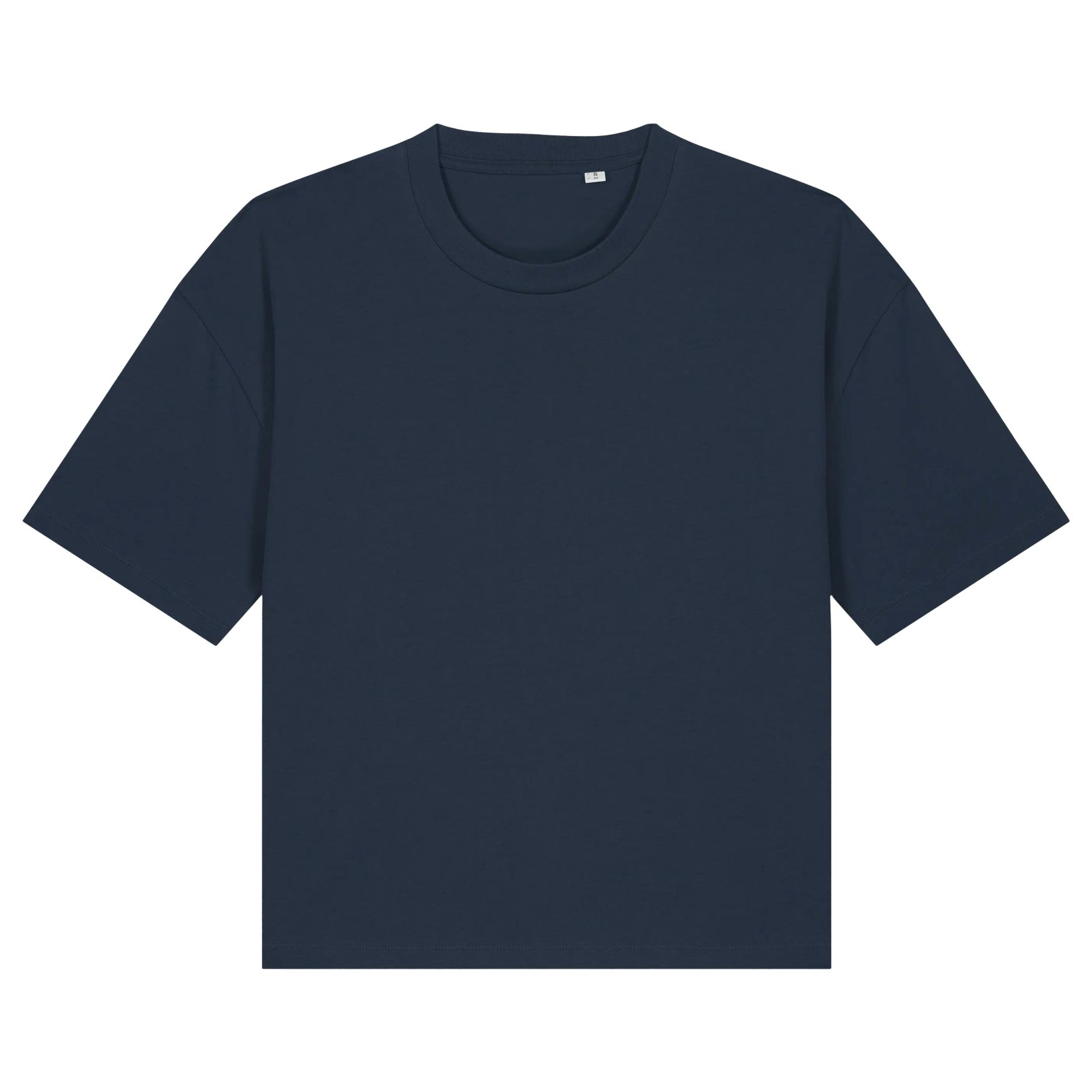 This boxy women's t-shirt is made of 100% organic cotton combed and carded. It features set-in sleeves, 1x1 ribbed collars, wrists and hem, as well as an inner neck tape in the main fabric. The wrists and hem are double-needle stitched. This model offers an ideal base for customization with your logo or design.