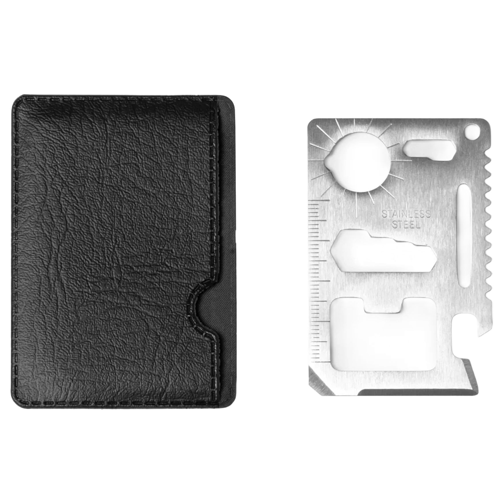 The DOZE is a multifunction tool in stainless steel integrating 11 functions: can opener, sharp knife, screwdriver, ruler, bottle opener, adjustable wrench, butterfly wrench, saw, direction indicator. Presented in a PU case.