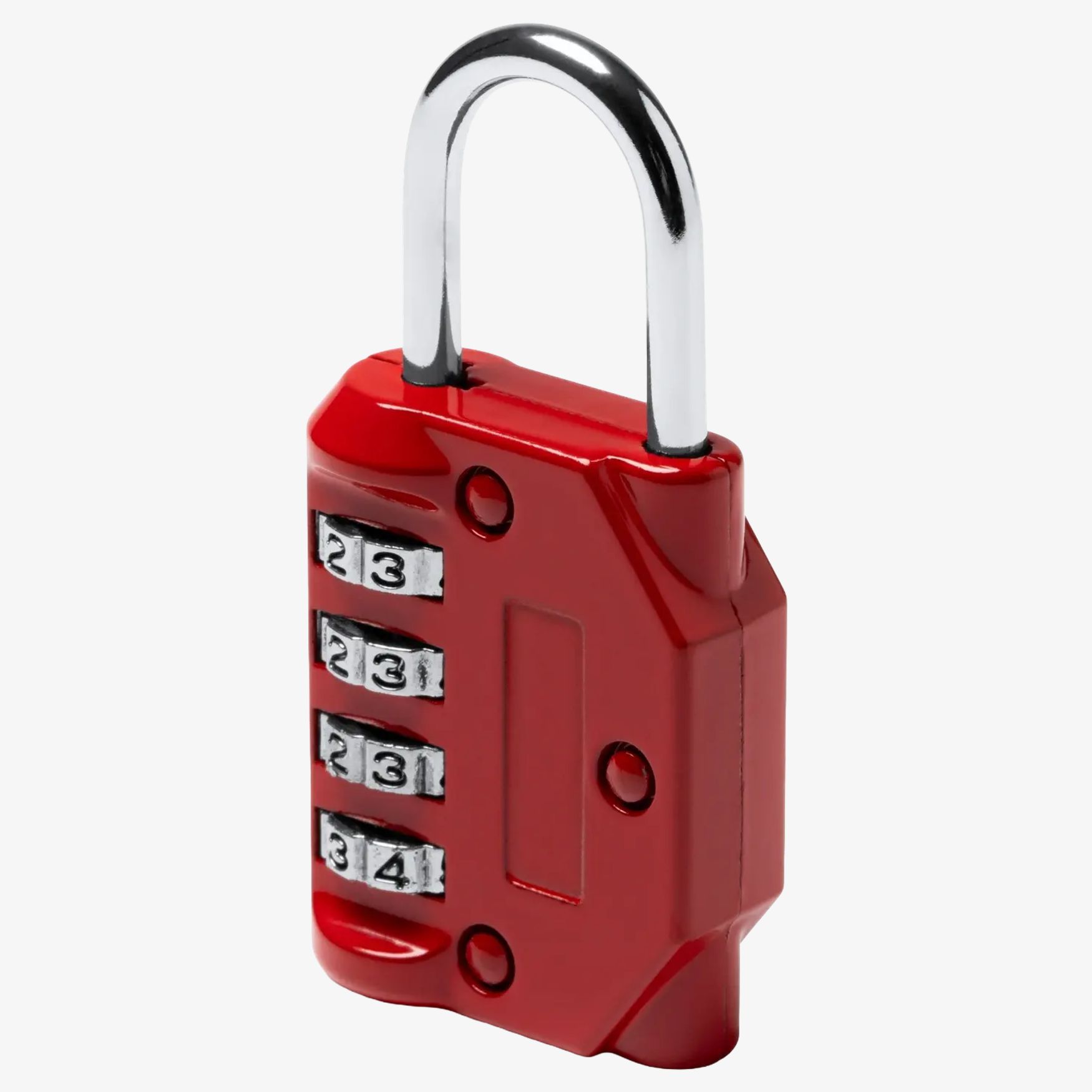 The Milvia padlock uses a 4-digit combination to reduce key use. Stainless steel body and shackle, compact format for daily use.