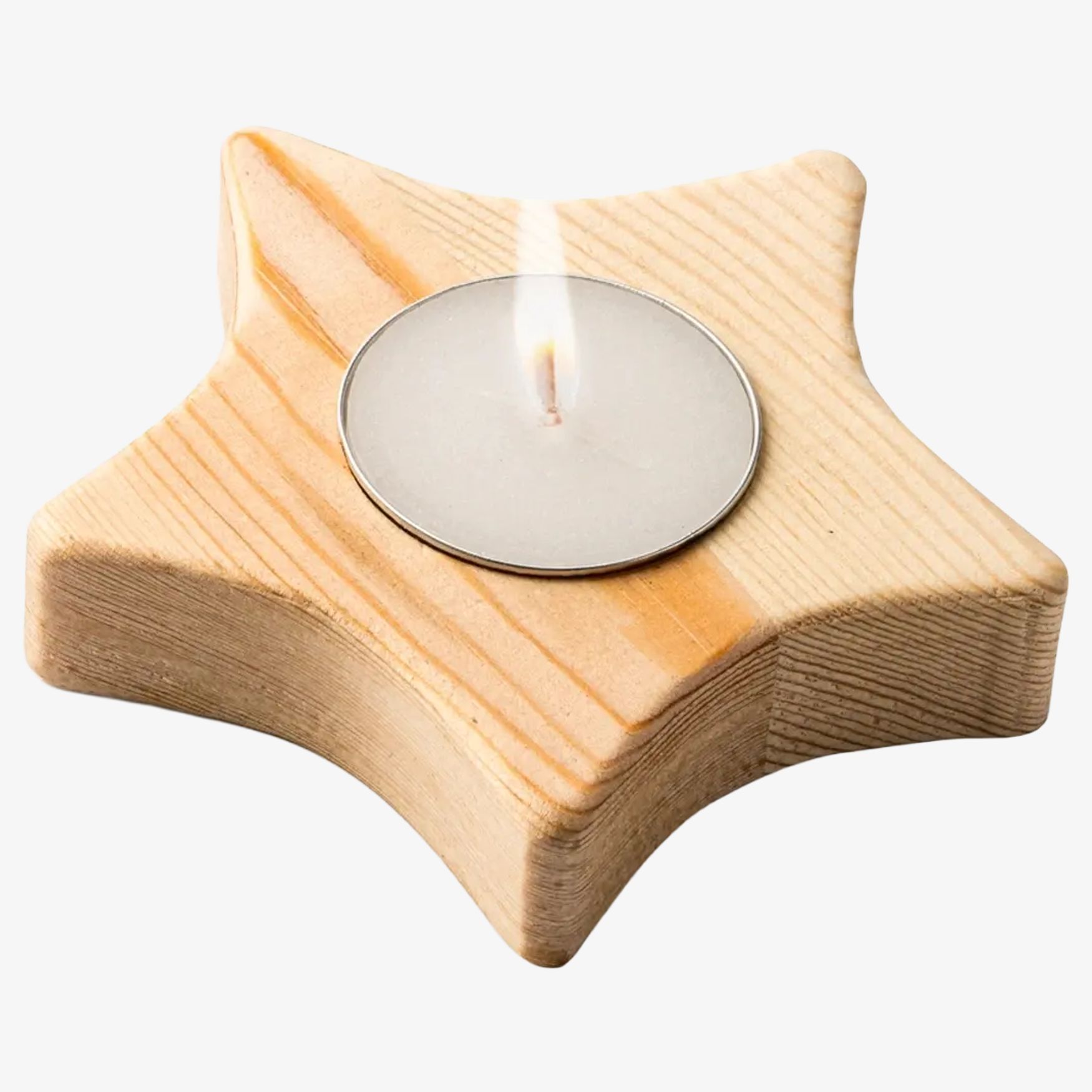 The star-shaped candle includes a pine wood base with Christmas patterns. It is made of paraffin.