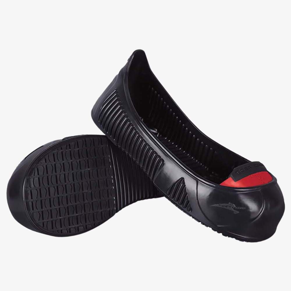Anti-slip overshoes designed to provide additional protection to work or personal shoes. They are made with a lightweight aluminum/titanium shell, offering resistance comparable to steel with reduced weight. The stretchy structure allows adaptation to different sizes, simplifying use and storage. They are designed for repeated use and can be hand-washed.