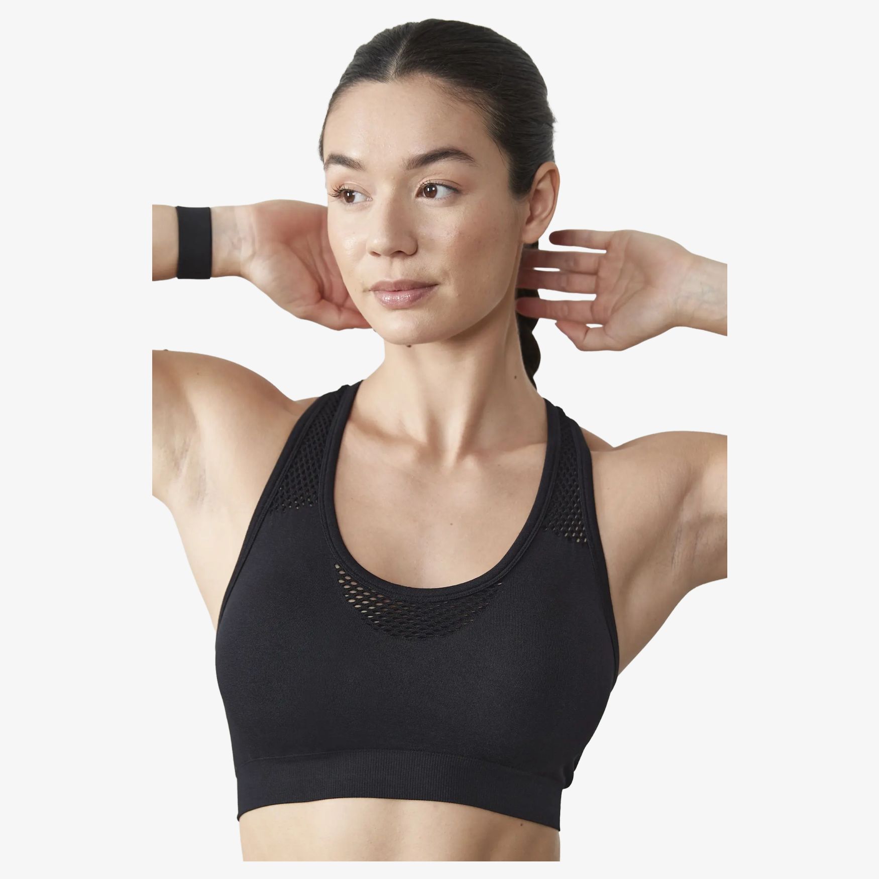 The crop top without is a sports bra with removable padded cups, racerback and light support. Seamless design with mesh inserts on the front, straps and back.