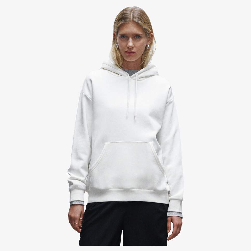 This women's hoodie is made of brushed fleece, offering a soft and comfortable drape. It is composed of organic cotton and recycled polyester. The design includes a shoulder seam and an inner clean finish at the neck. The double-layer hood features a half-moon detail for improved structure and is secured with drawstrings and recycled tips. A kangaroo pocket is included, along with ribbed cuffs and hem.