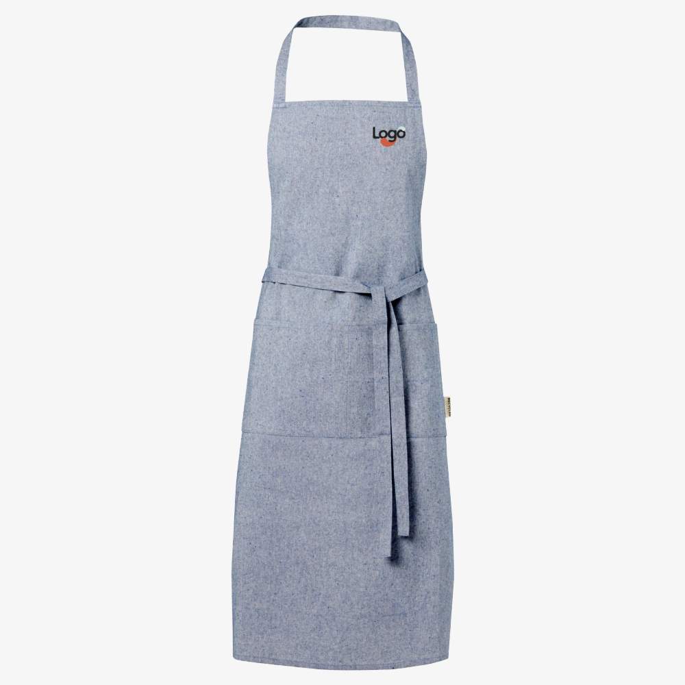 Apron made of a blend of recycled cotton-polyester. Includes 2 adjacent pockets with a combined size of 45 x 20 cm, and a meter-long cord closure. The recycled cotton is made from pre-consumption waste generated by textile factories during the cutting process. There may be minor variations in product color due to the nature of the production process. This feature undoubtedly contributes to a more authentic appearance. Neck strap length: 55 cm. Dimensions: 70 x 100 cm. Composition: 80% recycled cotton, 20% recycled polyester. This apron is customizable with embroidery for effective branding communication.