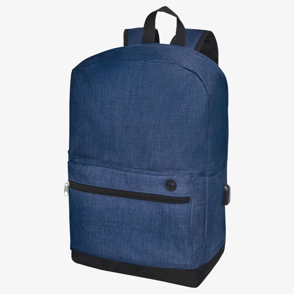 Backpack designed to safely transport a laptop and organize personal items. It features a main zippered compartment with a dedicated laptop sleeve for 15.6-inch laptops and a front zippered compartment for quick access to small accessories. It is equipped with an external USB port with an integrated USB-A cable, allowing for the connection and charging of mobile devices. The padded straps and carrying handle ensure optimal comfort. A mesh side pocket allows for storing a water bottle. Minor color variations may occur due to the nature of dyeing, weaving, and fabric printing. Dimensions: 33 x 14 x 44 cm. Composition: 100% polyester.
