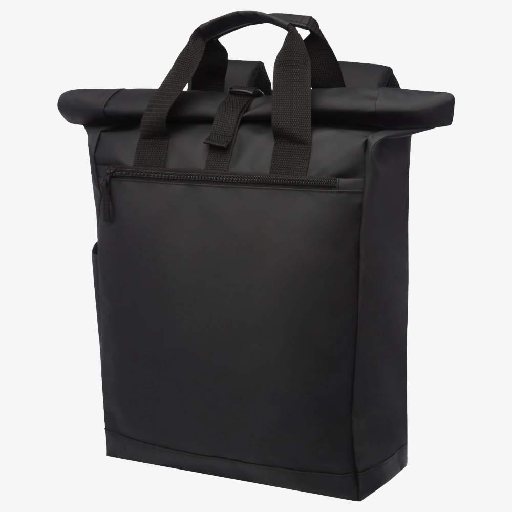 Backpack designed for the secure transport of a laptop and accessories. It offers protection against water splashes thanks to its tarpaulin material. The main compartment, featuring a zipper closure, allows for easy access to the contents. The straps and carrying handles are padded for added comfort. This backpack is suitable for daily use or short trips. It allows for efficient organization of belongings while protecting electronic equipment.