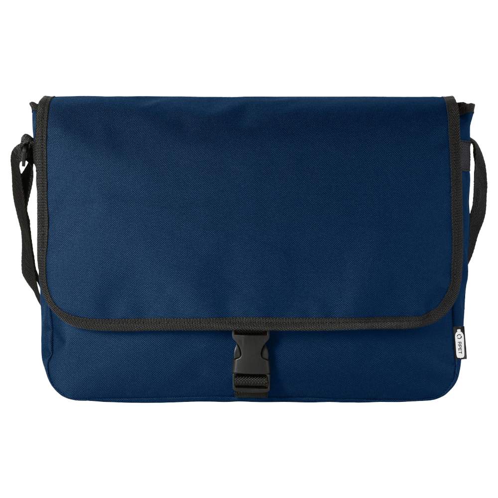 Recycled PET plastic shoulder bag with an adjustable strap. Includes a main compartment that closes with a flap and a buckle closure. Dimensions: 34 x 8.5 x 25 cm. Composition: 100% recycled polyester.