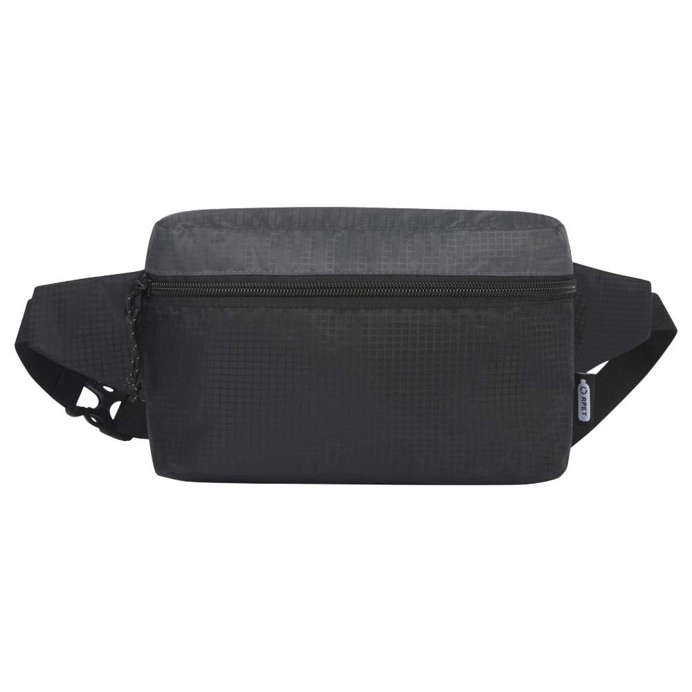 2.5-liter waist pack, made of recycled polyester with water-repellent treatment. It offers a main zippered compartment for storage and an adjustable belt for comfortable and secure carrying. An inner zippered pocket allows for organizing small items. This waist pack is designed for daily use and light outdoor activities. Its dimensions are 24 x 8.5 x 14 cm.
