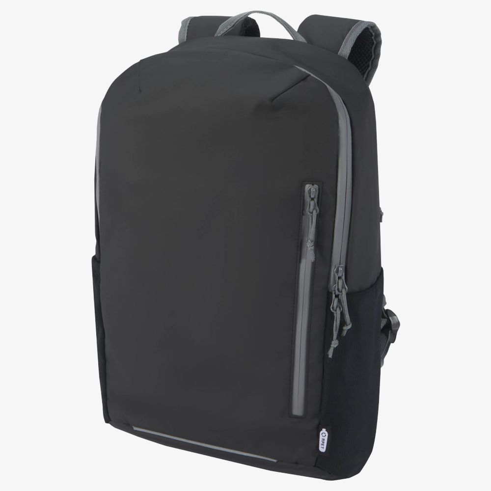 Backpack designed for the safe transport of a 15-inch laptop and accessories. Made from recycled materials, this bag offers a sustainable solution for daily commutes or travel. It includes a spacious main compartment, a dedicated padded laptop pocket, mesh pockets for optimal organization, and a front zippered pocket for quick access to small items. The padded shoulder straps and adjustable chest strap ensure optimal comfort, even when the bag is fully loaded. The reflective piping improves visibility in low light conditions.