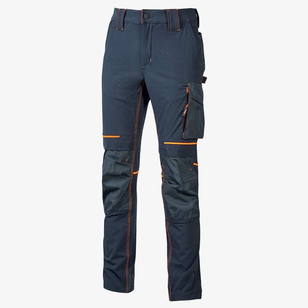 SLIM FIT pants made from U-4 fabric, offering comfort, softness to the touch, waterproofing, breathability and quick drying. This model is equipped with two spacious rear pockets, an elasticated waist with a discreet fastening system. A dorsal flap provides increased lumbar protection, while reflective bands at the front and rear improve visibility. A red reflex tape adorns the rear belt loops. The pants have a side tool pocket, a multifunctional side pocket with retractable badge holder, and two rear pockets, one with a flap and the other with a hook-and-loop closure. It is equipped with two knee pad pockets with easy top opening and a fully reinforced polyoxford 600D bottom. Hidden zip pockets are integrated under the large side pocket and under the right front pocket. The pants are reinforced with triple stitching. The central closure is ensured by a YKK zip and an anti-scratch button. Composition: 90% nylon, 10% elastane.