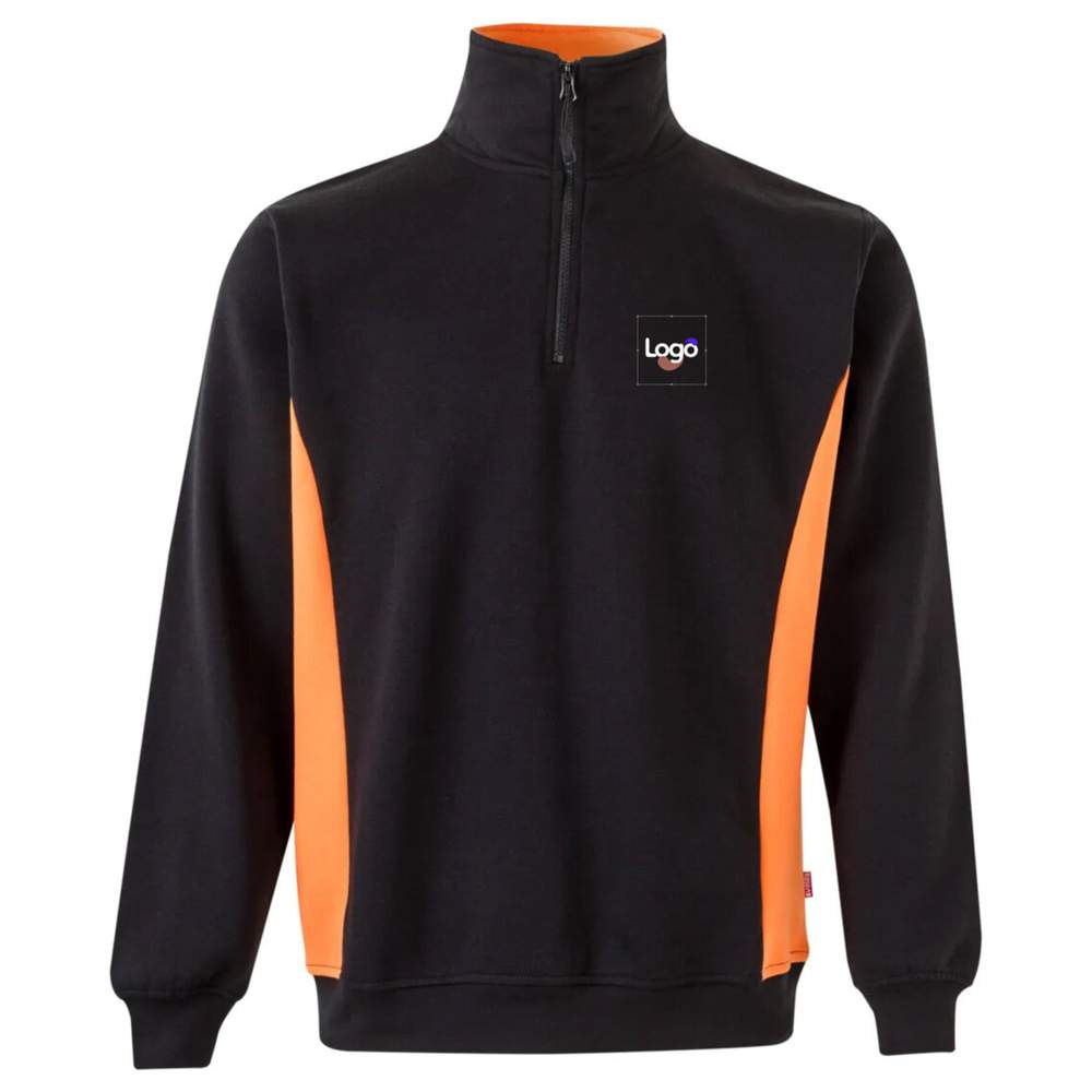 Zip-up two-color sweat in cotton polyester fleece. Zip-up high collar 1/3 with contrasting lining. Sides and cuffs in ribbing for optimal comfort. Anti-pilling treatment for increased durability. This sweat is ideal for customization by embroidery, allowing you to add your logo or your visual.