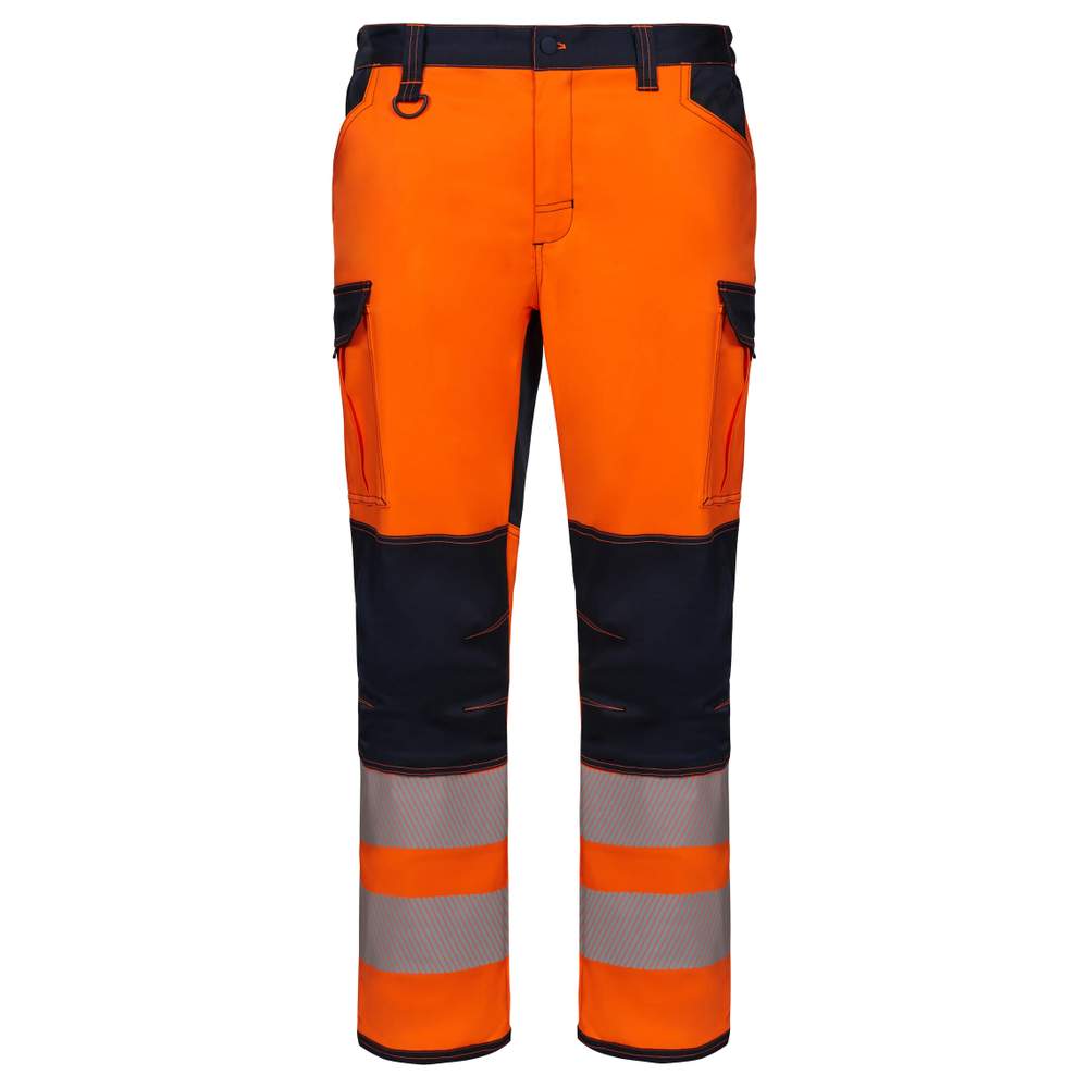 Work stretch pant designed for comfort and safety. It features a button closure with zipper fly, as well as segmented reflective strips heat-sealed on the leg hems for enhanced visibility. The side elasticated waist ensures optimal fit. The reinforced fabric at the knees and bottom of the pant improves durability. A compartment for knee pads, accessible from the bottom and secured with hook-and-loop tape, provides additional protection. Double safety stitching reinforces the garment's strength. Knee darts contribute to a precise fit. A plastic ring on one of the belt loops offers additional functionality. The pant has eight pockets for practical storage.