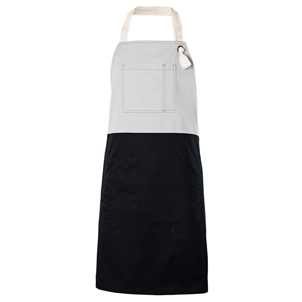Apron designed to offer protection and comfort during various activities. It is equipped with 2 beige ties for personalized adjustment. The neck strap is adjustable for comfortable wear. This apron is equipped with 3 pockets offering practical storage space for tools and accessories. The lower part of the apron is black, creating a visual contrast. Its dimensions are 81x75cm.
