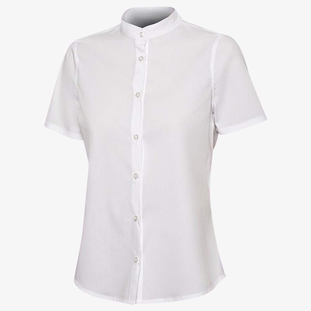 Women's chemisette. Fitted cut with front and back darts for better hold. Classic Mao collar. Buttoned closure with flap for easy wearing. Yoke in the back for a neat finish and greater freedom of movement. Spare button included for prolonged use.