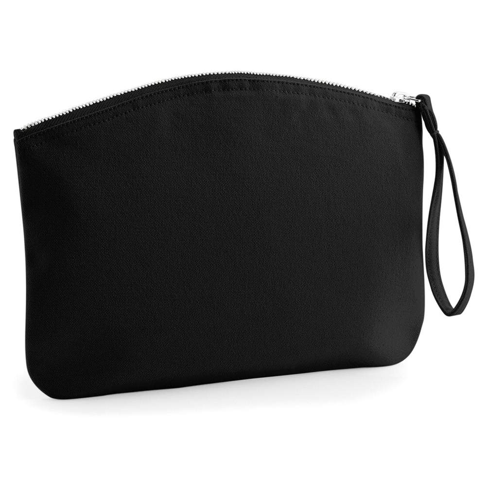 Pocket bag made of thick organic cotton canvas. This bag features a zip closure and a wrist strap, offering a practical solution for carrying personal items. It can be used in various situations and is available in two different sizes.