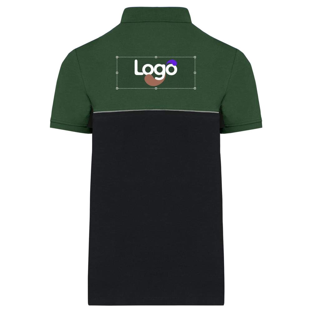 Bicolor eco-friendly short-sleeved polo designed for optimal comfort and modern style. Its fitted cut highlights the silhouette, while the ribbed collar provides comfortable support. The two-button placket in a matching color offers a neat finish. Contrasting passpoils between the bicolor parts of the garment add an original touch. Side slits with contrasting chevron bands allow for greater freedom of movement. Ribbed finishes at the bottom of the sleeves and double-needle hem at the bottom of the garment ensure increased durability. The Tear Away brand label facilitates customization. This polo is composed of 60% combed cotton and 40% recycled polyester, making it an eco-friendly choice. It also features an anti-pilling treatment for better resistance. This polo can be customized with embroidery, allowing you to add your logo or visual for effective communication.