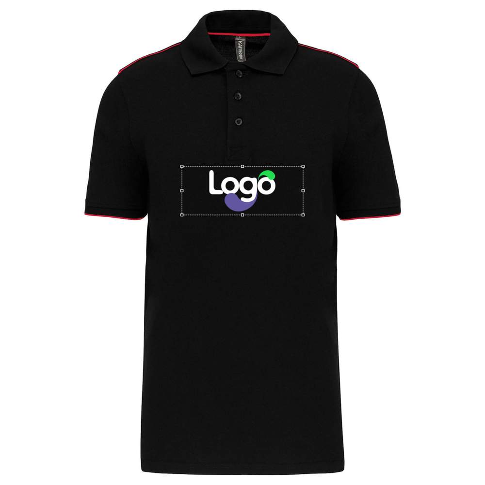 Short-sleeved contrasted polo shirt for men. Three-button placket with contrasting inner stripe. Ribbed collar with concealed neckband. Contrasting piping on the inside of the collar and shoulders. Ribbed finishes with a contrasting lacing at the bottom of the sleeves. Side vents with a contrasting chevron band for added comfort. Double-needle hem finish. Customization options include embroidery. Composition polyester, combed cotton pique knit. Anti-pilling treatment.
