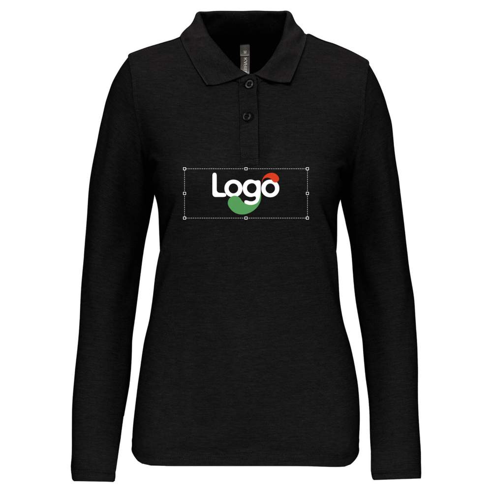 Long sleeve polo shirt for women, ideal for professional use. Button placket collar with two buttons in the same color. Contrast band neckline with clean finish strip. Bottom-of-sleeve finish with contrast band for more comfort. Side slits with contrast band. Hem finishing with double needle stitching. Possibility of customization with embroidery to display your logo or visual.