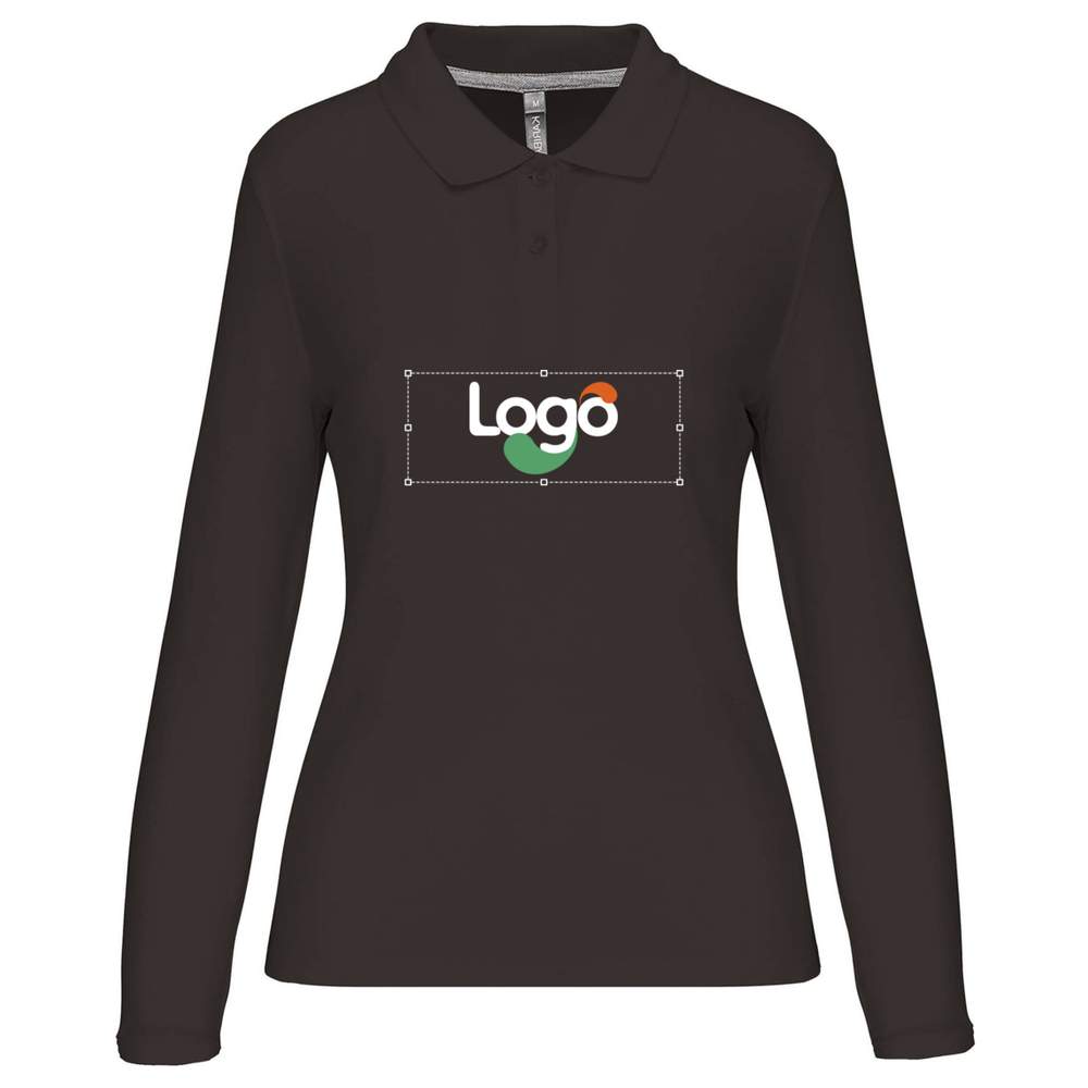 Long sleeve polo shirt for women, ideal for professional use. Button placket collar with two buttons in the same color. Contrast band neckline with clean finish strip. Bottom-of-sleeve finish with contrast band for more comfort. Side slits with contrast band. Hem finishing with double needle stitching. Possibility of customization with embroidery to display your logo or visual.