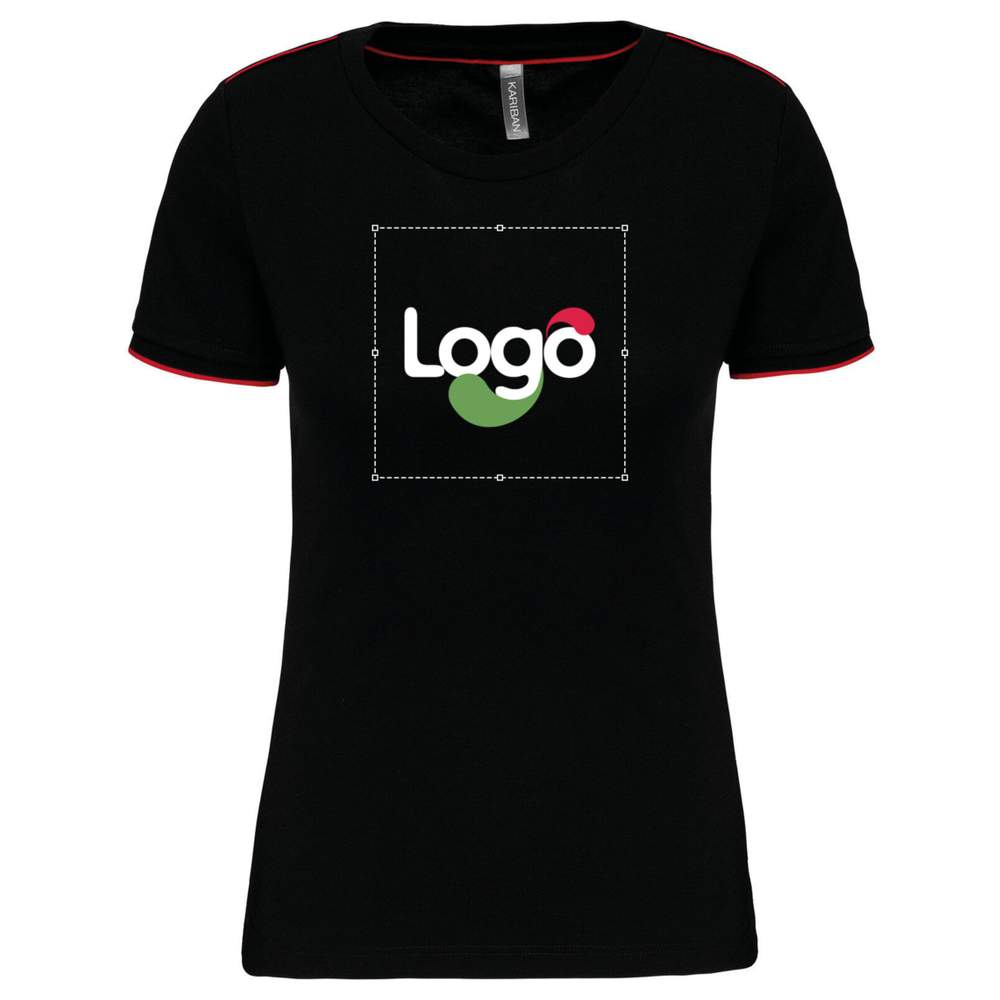 Short-sleeved t-shirt for women, made of cotton-polyester jersey. Round neck with elastane for optimal comfort. Contrasting piping inside the collar and shoulders, adding a touch of style. Finished hem with contrast binding. Double needle finish at the bottom of the garment for increased durability. This t-shirt is ideal for everyday use and offers excellent value for money. Composition: 65% polyester, 35% combed cotton jersey fabric. Anti-pilling treatment for increased longevity. Possibility to customize this t-shirt with your logo or visual.