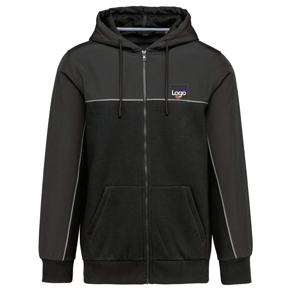 Bicolor zip-up hooded sweatshirt. Unisex and eco-friendly model. Straight cut. 2 kangaroo pockets. Two-part hood with round drawstring with rubber tips. Contrasting fabric inserts on front, back, and upper sleeves. Ton-on-ton zipper closure at the front. Softshell back half moon. Contrasting Silver piping on front inserts and sleeves. Hook and Silver chevron clean band in the collar. Tubular 2 x 2 ribbed cuffs and bottom. Detachable brand label. Composition: 60% cotton, 40% recycled polyester. Insert fabric: 2-layer water-repellent softshell 95% polyester, 5% elastane. Possibility of customization with embroidery to integrate your logo or visual.