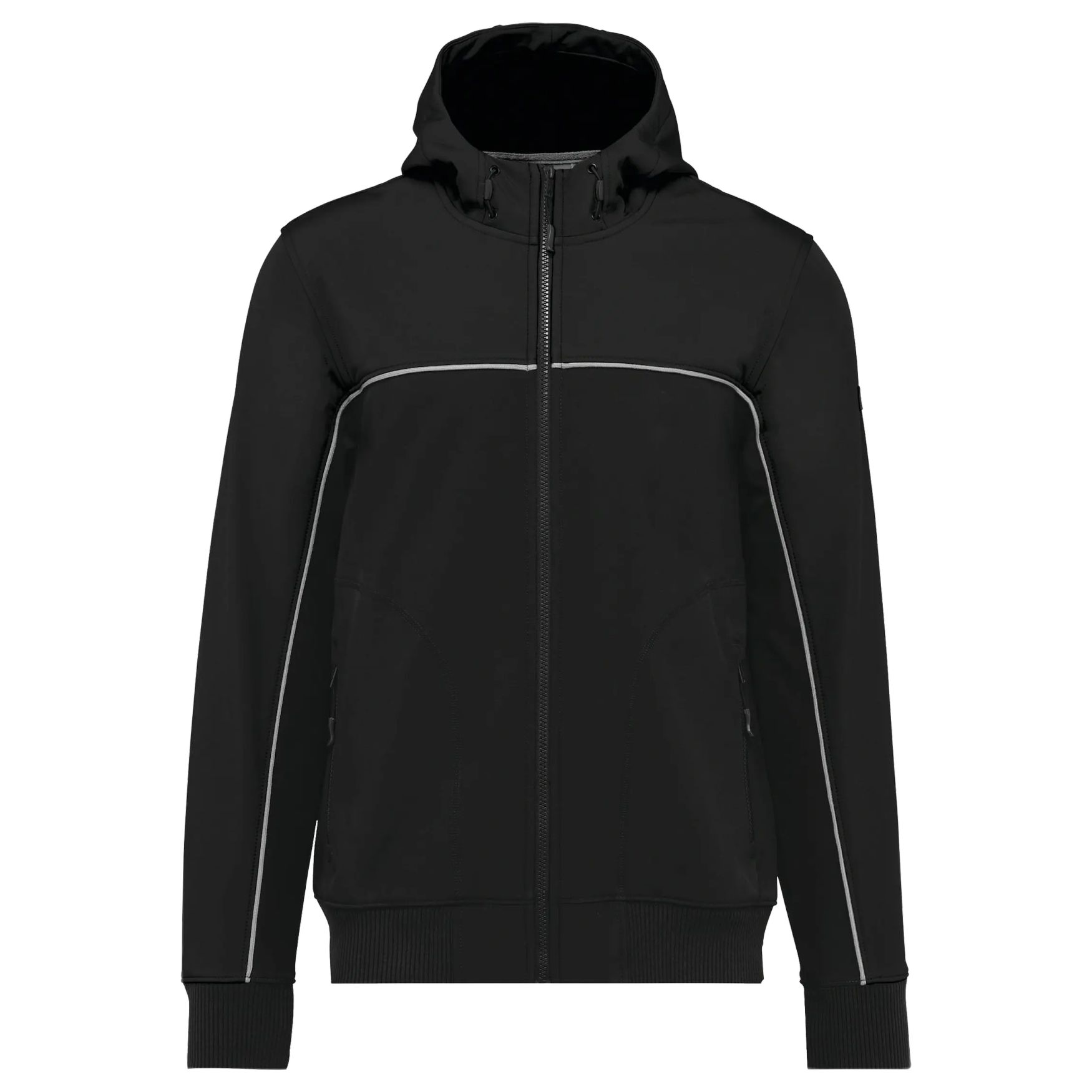 Unisex softshell jacket 3 layers. Plastic zipper with ton-on-ton pull tab. 2 zipped pockets with pull tabs on the front. 3-part adjustable hood using stoppers inserted in the seam. Clean edge inside contrasting collar with hook loop. Elasticated 3-compartment pen holder on the left sleeve. Contrasting welt between parts of the bicolor garment (body and sleeves front and back). Double-sided ribbed elastic at the bottom of sleeves and garment. Tear Away brand label. Laminated fabric 3 layers breathable 3000 /24 h and waterproof 5000 mm. Outside: 96% polyester, 4% elastane. Intermediate layer: Breathable and waterproof membrane. Inner layer: Microfleece. BIONIC-FINISH® ECO treatment (waterproofing without fluor for optimal performance).