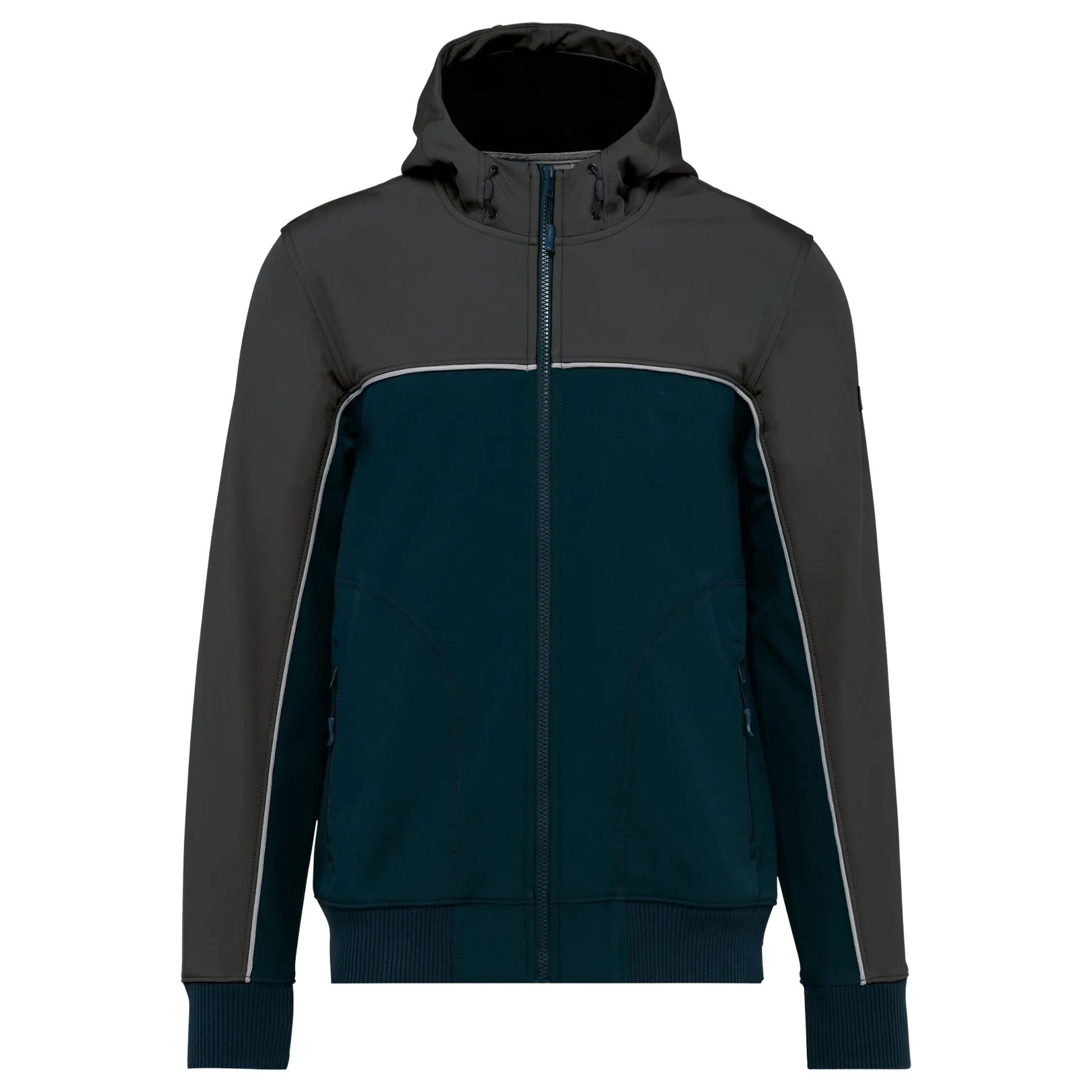 Unisex softshell jacket 3 layers. Plastic zipper with ton-on-ton pull tab. 2 zipped pockets with pull tabs on the front. 3-part adjustable hood using stoppers inserted in the seam. Clean edge inside contrasting collar with hook loop. Elasticated 3-compartment pen holder on the left sleeve. Contrasting welt between parts of the bicolor garment (body and sleeves front and back). Double-sided ribbed elastic at the bottom of sleeves and garment. Tear Away brand label. Laminated fabric 3 layers breathable 3000 /24 h and waterproof 5000 mm. Outside: 96% polyester, 4% elastane. Intermediate layer: Breathable and waterproof membrane. Inner layer: Microfleece. BIONIC-FINISH® ECO treatment (waterproofing without fluor for optimal performance).