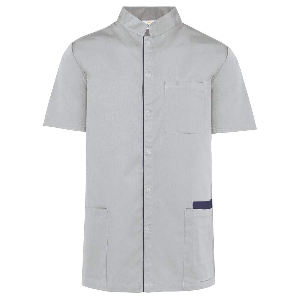 Kitchen shirt made of polycotton with a fitted cut. It features a mandarin collar and a snap button front closure. It has a chest pocket with a pen compartment on the left side, as well as two large front pockets, one on the right with a double compartment and a contrasting edge. A contrasting piping accents the placket and the back yoke. A name tag is present inside the garment, as well as a removable brand label.