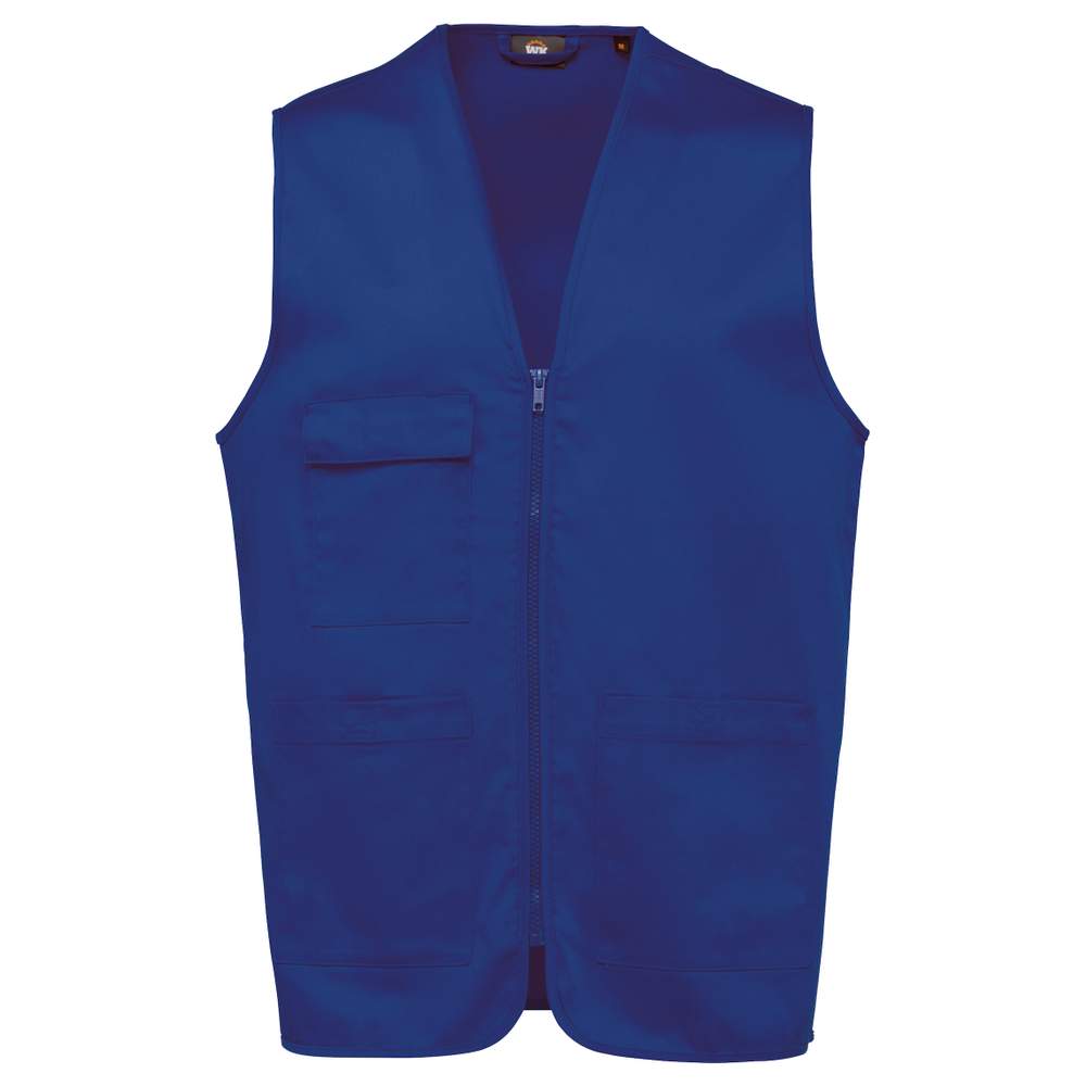 Unisex polycotton multipocket gilet. Fitted cut. 2 large front pockets with Velcro strap + 1 chest pocket with pen compartment. Plastic zip closure in tone on tone. Interior hook link at collar. Slightly elongated back. Bias finish in tone on tone at armholes and garment edge. Name tag inside the garment. Tear Away brand label. Composition : Outside : 65% polyester, 35% cotton.