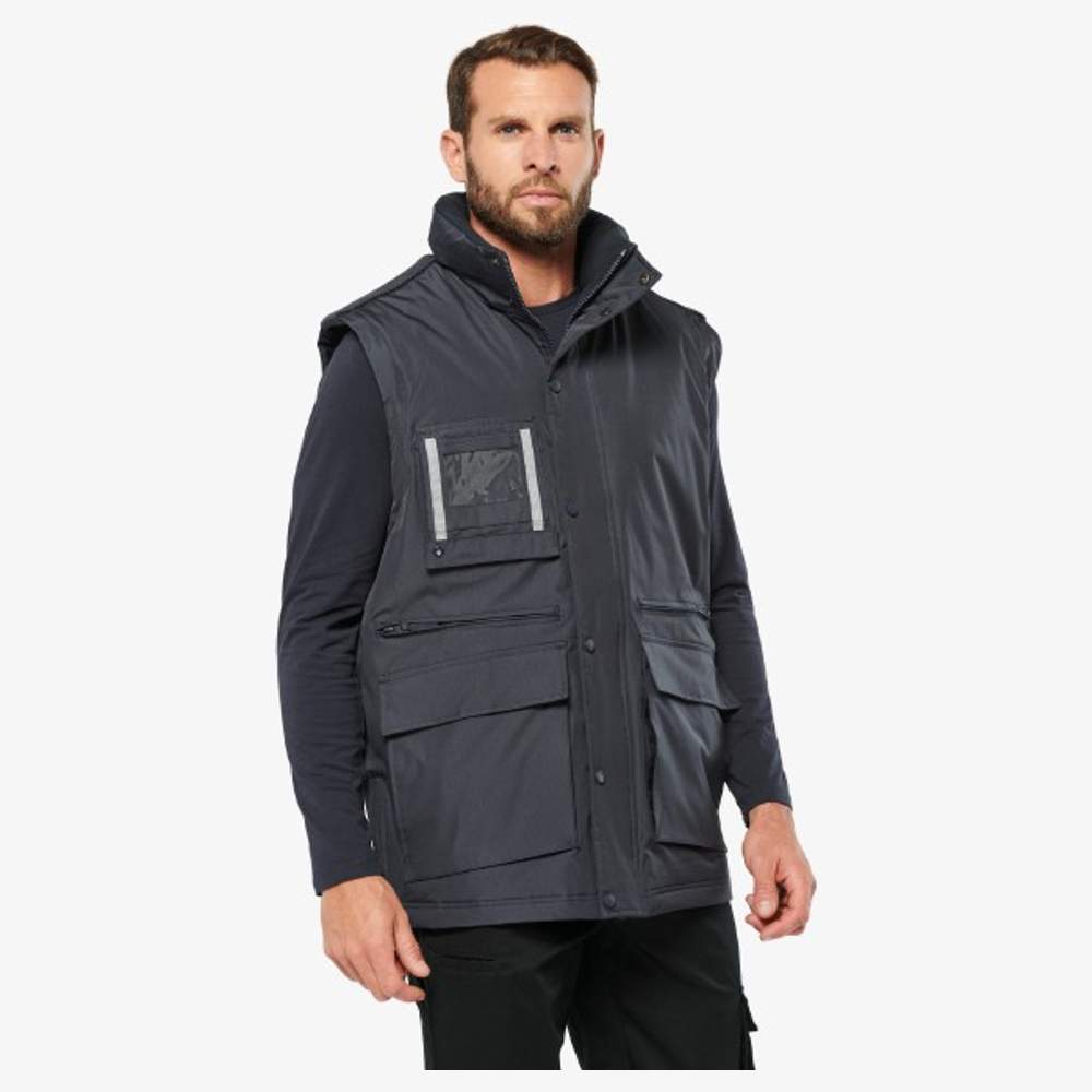 Work parka for men with detachable sleeves, offering increased versatility. This garment features a secure zip closure with a press-stud flap. The detachable sleeves allow the parka to be transformed into a bodywarmer, adapting to different weather conditions. It is equipped with five functional front pockets, including a transparent badge pocket for easy identification. An inner pocket provides additional storage space. Reflective strips on the back and chest pocket improve visibility. Reinforced shoulder straps increase the durability of the garment. A zippered ease opening at the bottom of the garment allows for personalized adjustment. The size is adjustable thanks to an inner drawstring. The hood is integrated into the collar for added protection.
