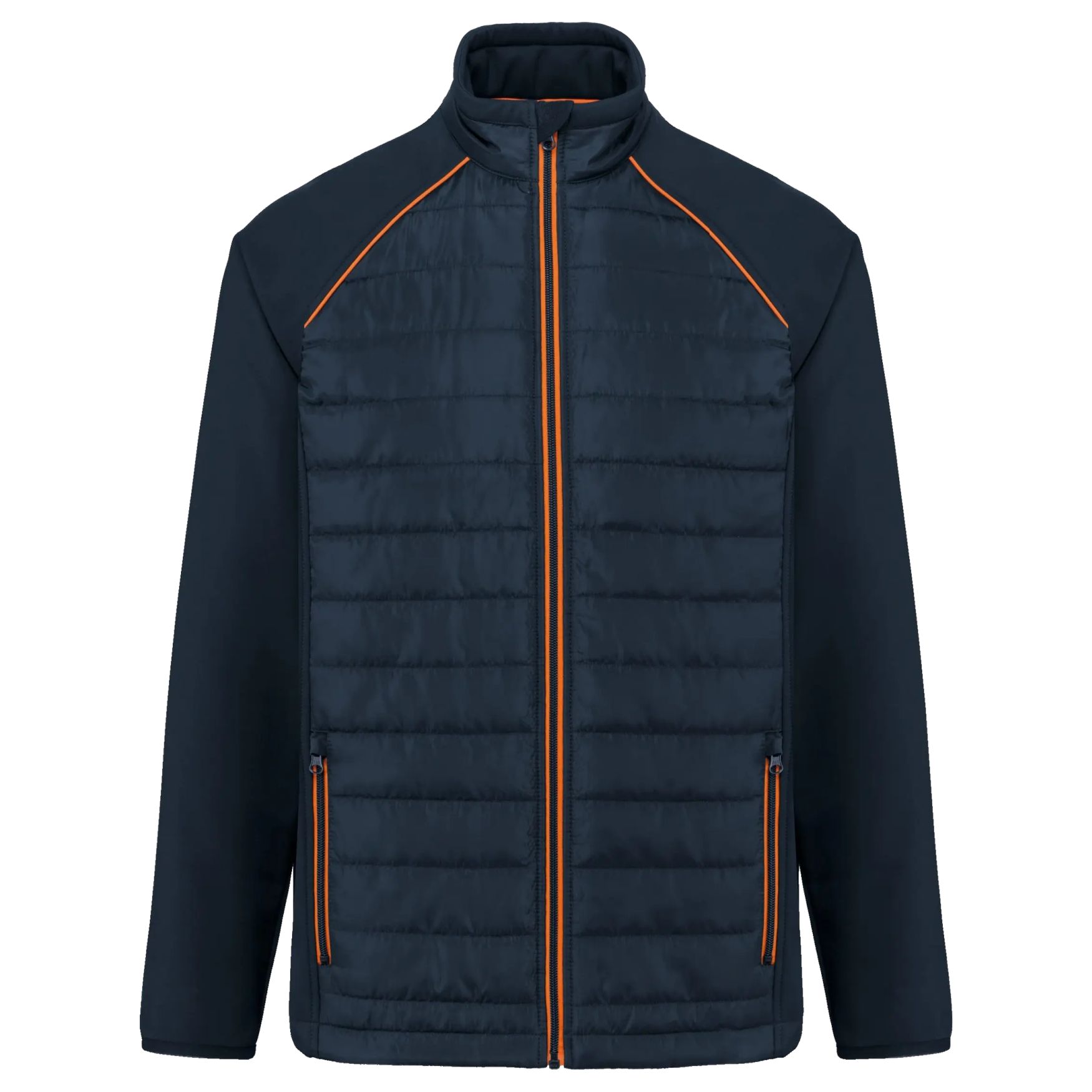 Unisex work jacket. Two zipped front pockets. One zipped interior pocket on the right side. One name tag fixed inside left. Contrasted piping at sleeves and inside collar. Front zip closure and contrasted pockets. Invisible zip for customization at bottom of garment. Composition: 100% polyester. Softshell 2 layers, stretch fabric in all directions for more ease with an inner polar layer for more warmth on the sleeves and shoulders. Front and back: 100% polyester taffeta 230T with coating.