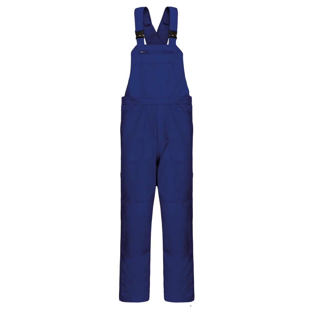 Unisex work overalls designed to offer comfort and functionality. They are made of twill fabric for good resistance to wear. They feature five front pockets, including two patch pockets and a front zippered pocket with a pen pocket. A patch pocket is also present on the back. The straps are adjustable with a plastic buckle, allowing for personalized adjustment. A wide elastic at the back ensures greater freedom of movement. The fly is equipped with a zipper. The side opening is secured with a double-button tab. A name tag is present inside. The seams are reinforced and knee reinforcements are added for increased durability. A hanging loop is also included.