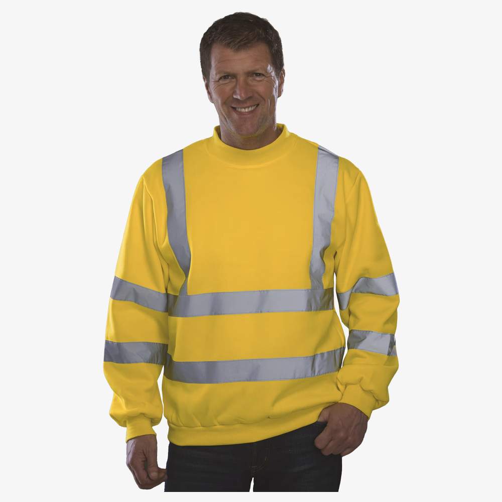 This high visibility sweatshirt offers good visibility in low light conditions. It features a clean neckband, set-in sleeves, and ribbed cuffs and hems. It includes two 5 cm wide reflective strips around the body, arms, and one on each shoulder. The finishes are made with double-needle stitching for increased durability.