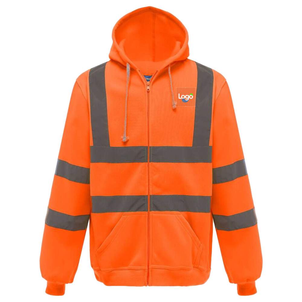 This high visibility zipped hoodie offers excellent visibility thanks to its two reflective strips of 5 cm around the body, arms and shoulders. It features a fixed hood with an adjustable drawstring, a full-length front zip, and ribbed cuffs and hem. Double-needle stitching ensures increased durability. This garment is available in Hi Vis Yellow and Hi Vis Orange, compliant with the EN ISO20471 Class 3 standard. Its composition of 100% anti-pill polyester ensures optimal comfort and increased resistance. Possibility of customization by embroidery to add your logo or your visual.