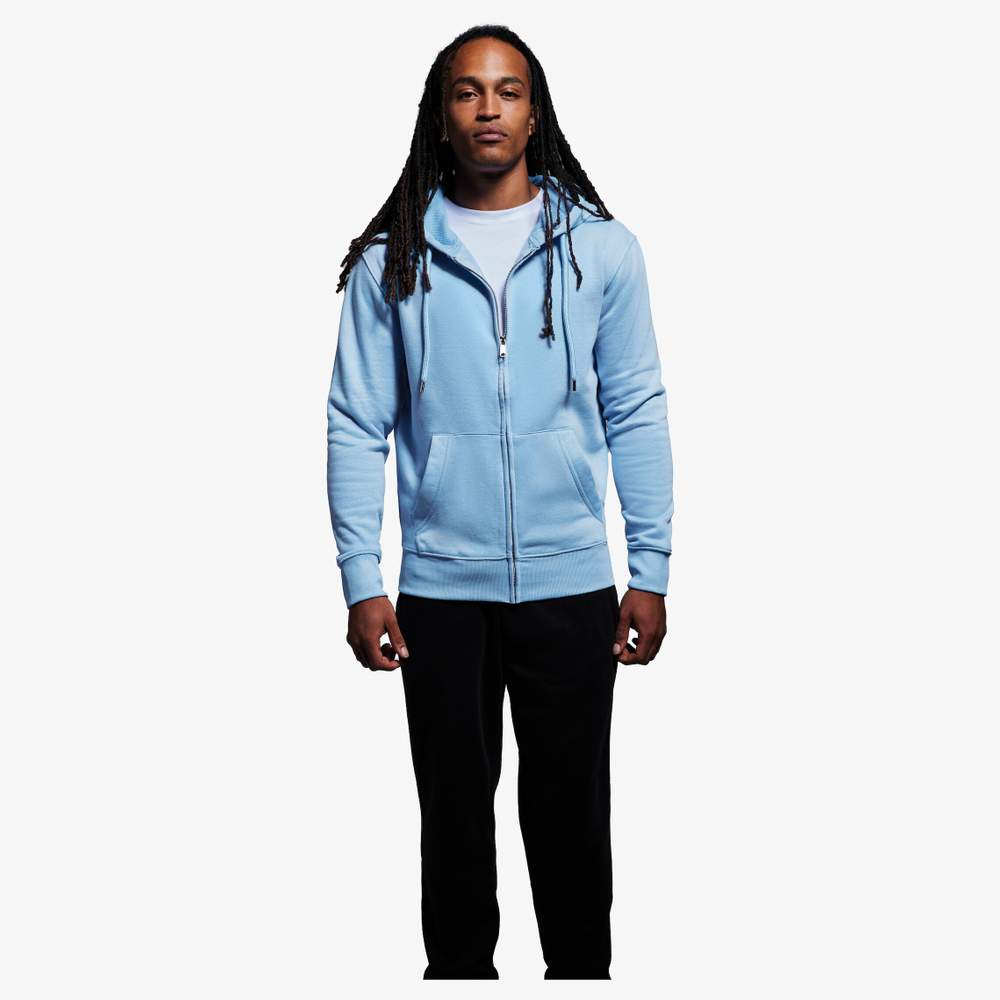 Sudadera con cremallera para hombre en tejido de piel de melocotón suave al tacto. Capucha de punto acanalado. Cierre con cremallera y cordones de ajuste sin níquel. Interior de felpa rasurada. Terminaciones a doble puntada de alta calidad. Puños acanalados recortados y cosidos dos en uno. Bolsillos tipo canguro. Etiqueta de tamaño del mismo color.