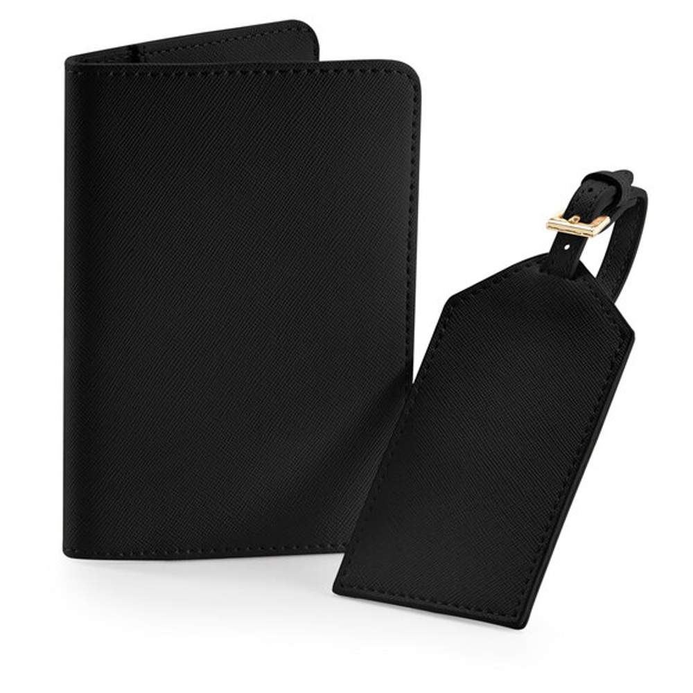 Conjunto de accesorios diseñado para facilitar la organización de los viajes. Este kit incluye una etiqueta de identificación y una funda destinada a alojar un pasaporte. El conjunto se distingue por un borde dorado para un aspecto refinado y una etiqueta TearAway para una identificación fácil. Las dimensiones de la funda para el pasaporte son de 10,5 x 15,5 cm, mientras que las de la etiqueta son de 6 x 11,5 cm. La composición del conjunto es de 100% poliuretano con un grano fino Saffiano.
