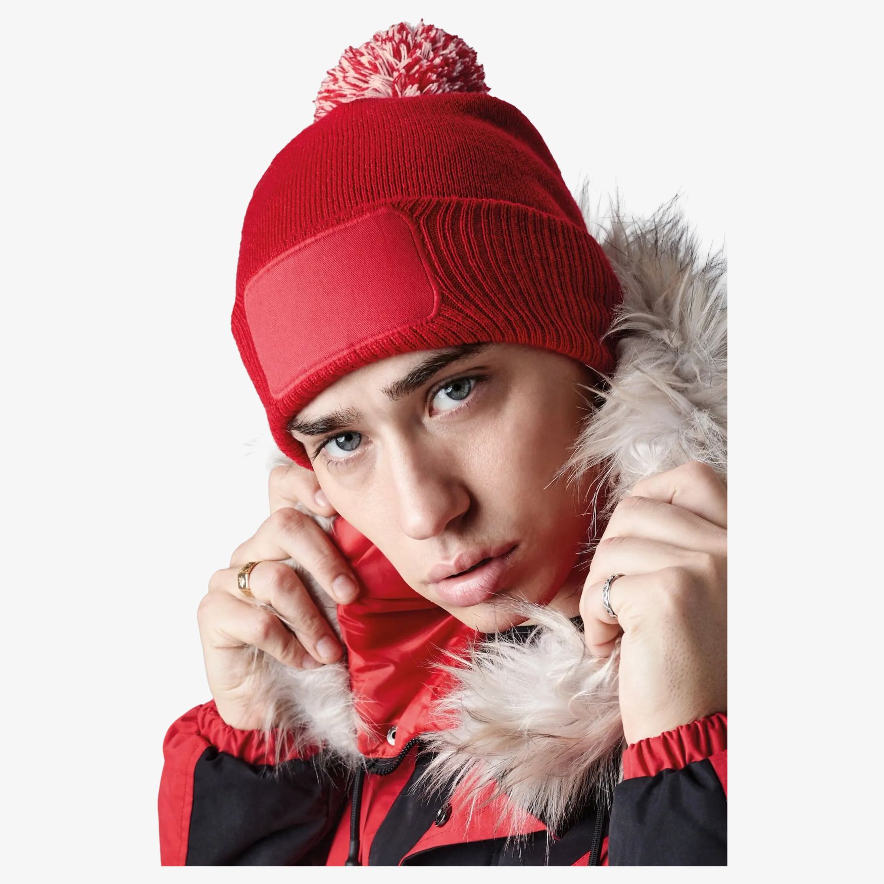 Gorro con parche y pompón bicolo. Jersey doble capa con revés de punto elástico. Parche en algodón cergé con zona imprimable 10x 5cm. Etiqueta desmontable. Composición : 100% acrílico (Heather Grey: 55% poliéster, 45% acrílico).