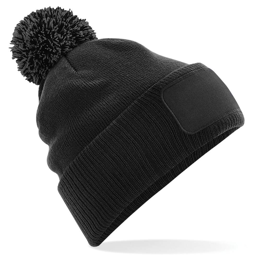Gorro con parche y pompón bicolo. Jersey doble capa con revés de punto elástico. Parche en algodón cergé con zona imprimable 10x 5cm. Etiqueta desmontable. Composición : 100% acrílico (Heather Grey: 55% poliéster, 45% acrílico).