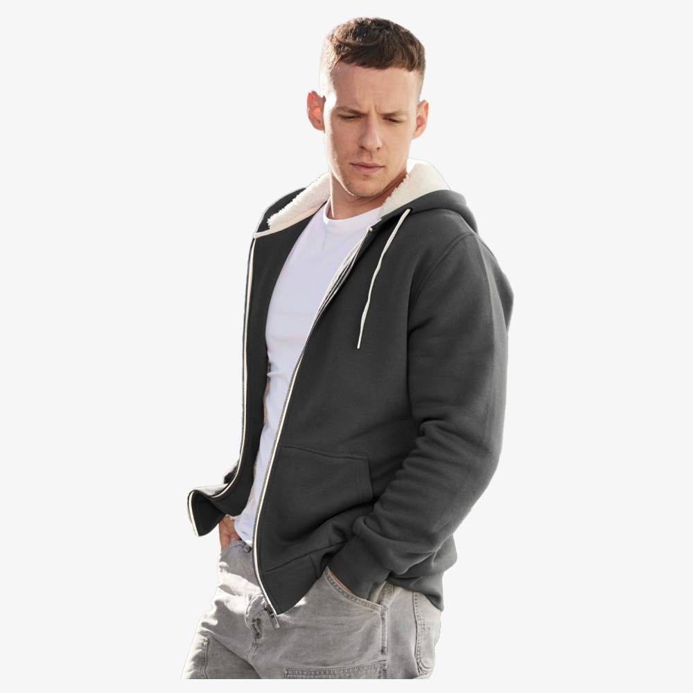 Chaqueta doble cara para hombre, fabricada a partir de una mezcla de algodón y poliéster. El forro de poliéster asegura un confort térmico óptimo. Tiene una capucha con cordón de ajuste y una cremallera de color contrastante. Un bolsillo kanguro en la parte delantera ofrece un espacio de almacenamiento práctico. Las muñecas con elástico aseguran un ajuste cómodo y seguro. El uso de cremalleras YKK garantiza una mayor durabilidad.