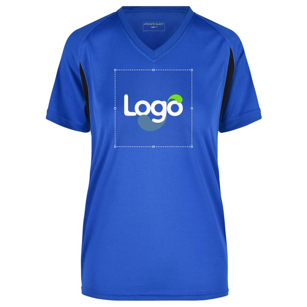 Esta camiseta de running para mujeres respirante con escote en V está diseñada para ofrecer un confort óptimo durante la carrera. Fabricada a partir de poliéster ligero, asegura una regulación eficaz de la transpiración y un secado rápido. Los paneles de malla contrastantes mejoran la ventilación, mientras que la impresión reflectante en la espalda garantiza una visibilidad aumentada en condiciones de poca luz. Su corte ajustado ofrece una libertad de movimiento óptima. Esta camiseta es personalizable, permitiendo la adición de su logo o de su diseño.