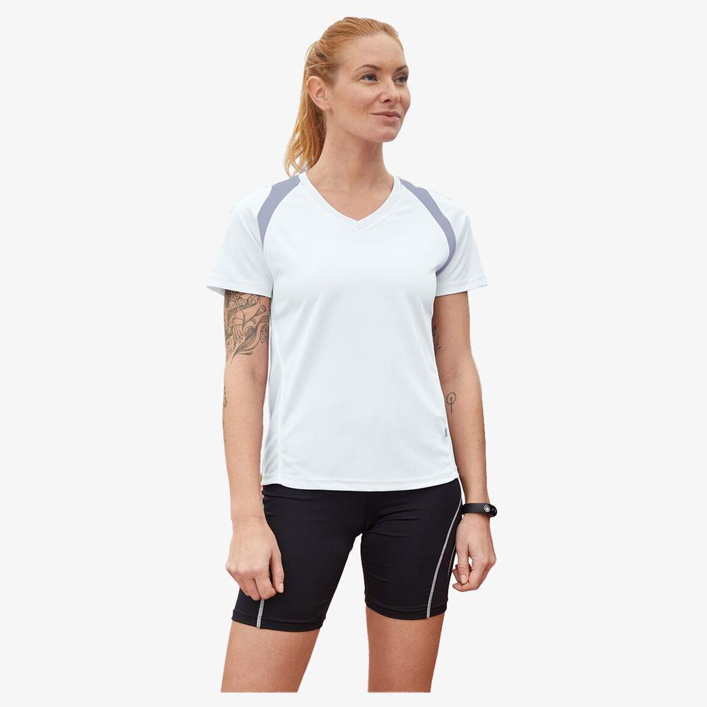 Esta camiseta de running para mujeres está diseñada en poliéster para un confort óptimo durante sus actividades deportivas. Ofrece una buena absorción de la humedad y un secado rápido, permitiéndole mantenerse seca y cómoda. Su corte ajustado y su cuello en V ofrecen libertad de movimiento y un aspecto deportivo. Posibilidad de personalización para mostrar su logotipo o su diseño.