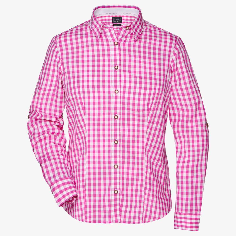 Camisa a cuadros de corte ajustado, femenina, en popelina de alta calidad con acabado easy care. Fácil de planchar. Mangas remangables con paso y botón. Bajo curvado. Botones de imitación de cuerno. Posibilidad de personalización con bordado para un resultado único. Composición: 100% algodón.