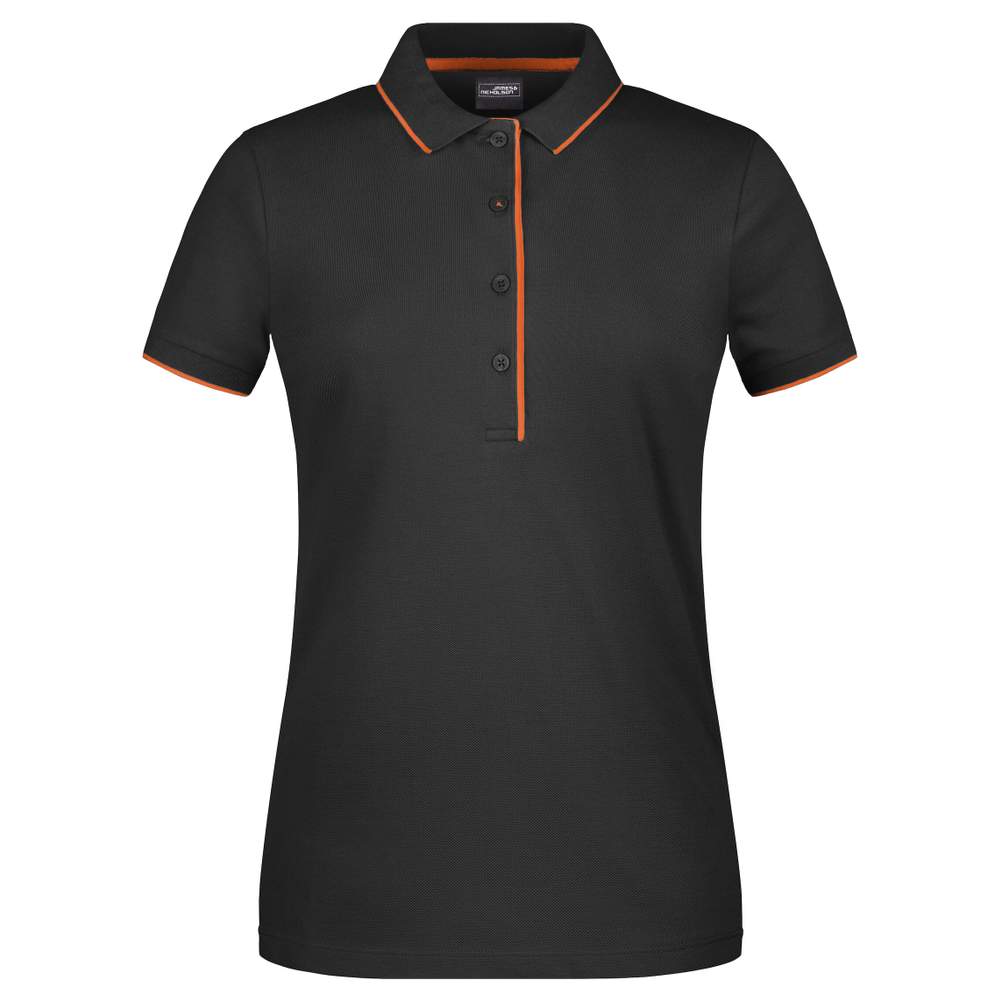 Polo clásico para mujer, con corte ajustado y detalles contrastantes. Piqué de alta calidad en algodón peinado ringspun. El cuello del polo y las muñecas tienen rayas contrastantes. Un botón tiene un color contrastante mientras que los botones son a juego. Tiene aberturas laterales y cuatro botones.