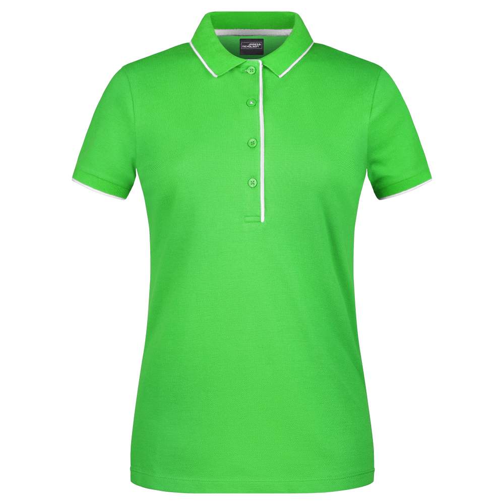 Polo clásico para mujer, con corte ajustado y detalles contrastantes. Piqué de alta calidad en algodón peinado ringspun. El cuello del polo y las muñecas tienen rayas contrastantes. Un botón tiene un color contrastante mientras que los botones son a juego. Tiene aberturas laterales y cuatro botones.