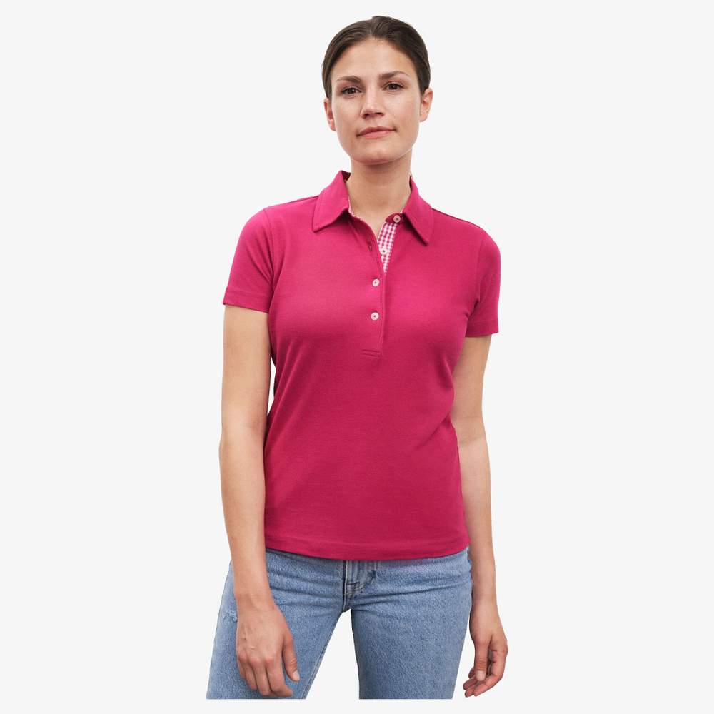 Polo para mujer, con corte clásico y cuello listo para usar. Confeccionado en algodón peinado ringspun para un confort óptimo. Presencia de embozado de tendencia y aberturas laterales. Cierre con 4 botones de color contrastante y media luna del mismo tono.
