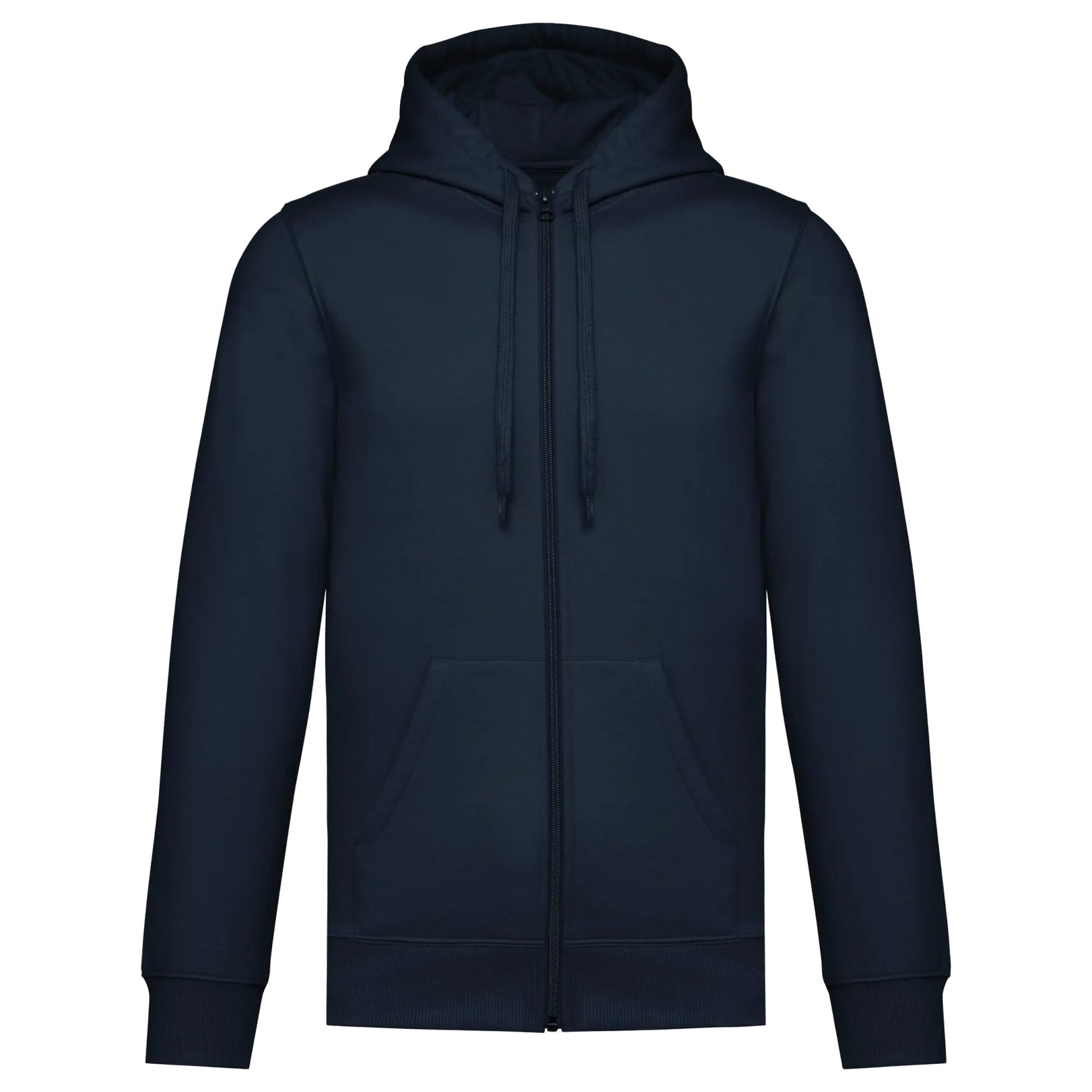 El sweat-shirt zippé con capucha unisex está confeccionado en molleton pillado con corte straight y montaje de corte y confección. Incluye un borde acanalado 2x1 con montaje tubular en el cuello, bajos de mangas y dobladillo para un acabado cuidado, así como un bolsillo canguro. El cierre es una cremallera de nailon. La capucha está forrada en jersey de policotón y equipada con un cordón plano. Una cinta de refuerzo en jersey tono sobre tono está en el interior del cuello. La etiqueta de la marca está ausente para facilitar la personalización gracias a un chip de talla.