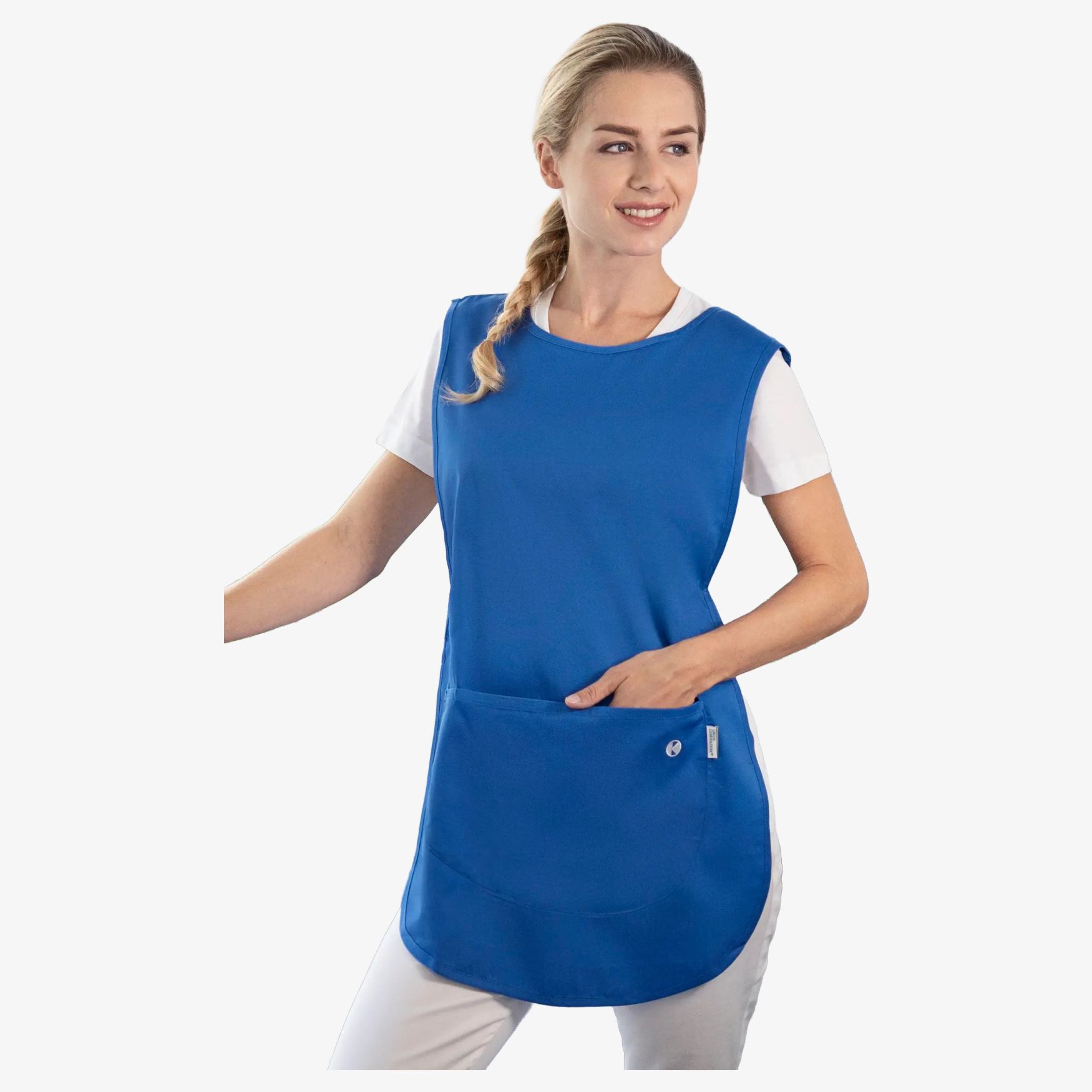 El pull-over tunic tablier ks64 es una túnica sin mangas para poner, adecuada para los sectores de la salud y la belleza. Incluye un gran bolsillo frontal con compartimentos para bolígrafos y ajustes a los lados.