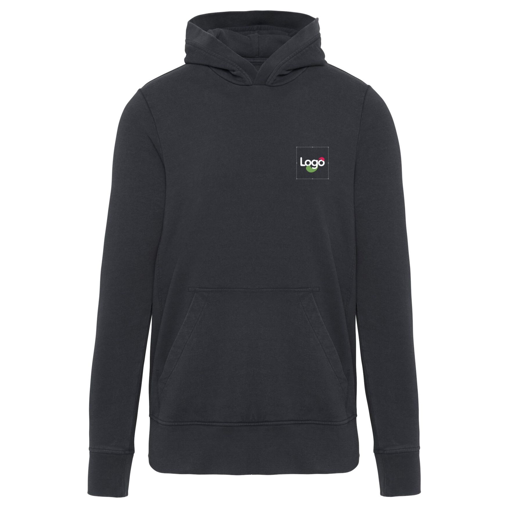 Sudadera con capucha para hombre de algodón con felpa sin perchado y capucha cruzada con forro. Bolsillo canguro y acabados de canalé. Tratamiento que aporta un aspecto desteñido y envejecido, con posibles variaciones de color según las piezas. Etiqueta de talla sin etiqueta en el cuello, apta para la personalización.