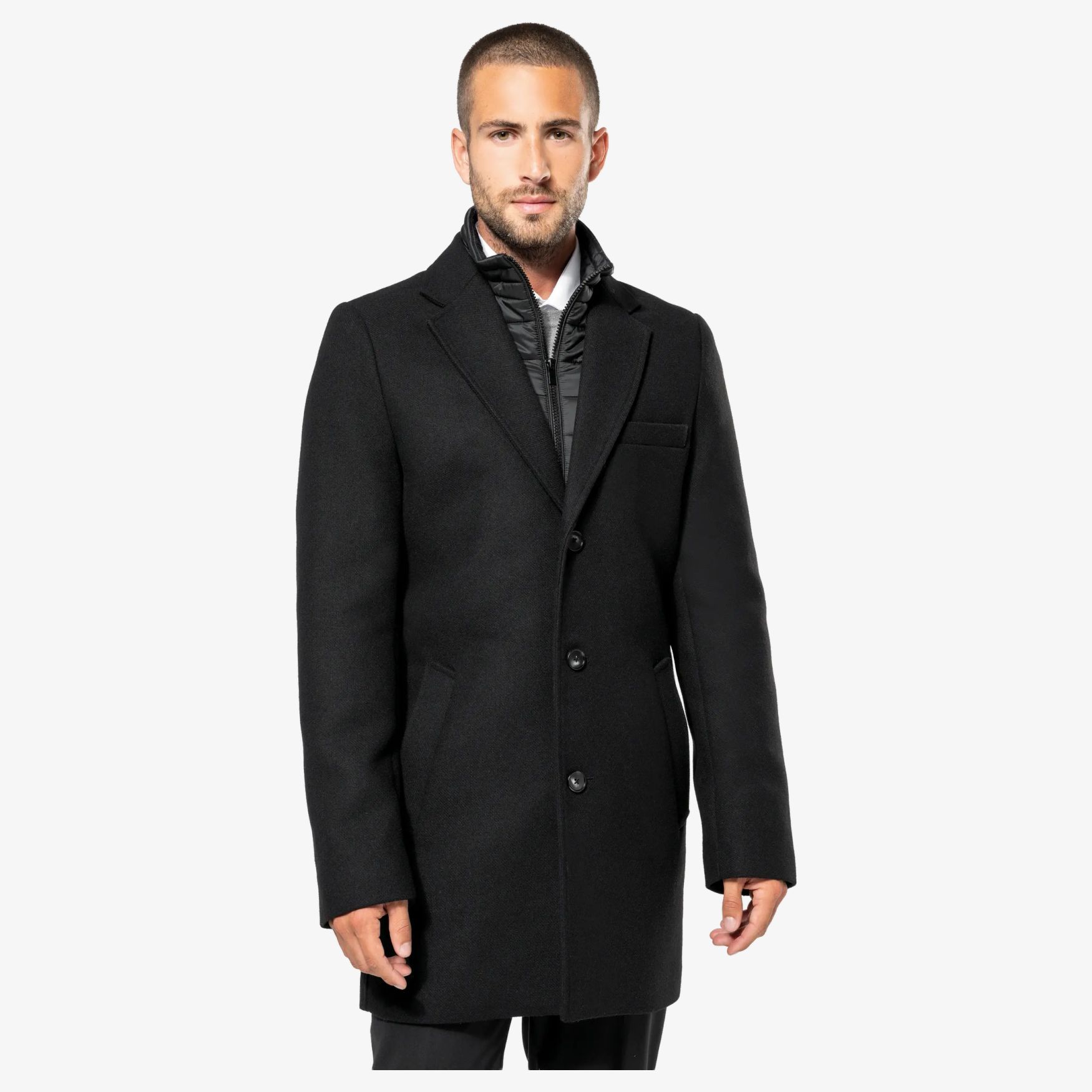 El Abrigo de hombre es un abrigo de corte recto con cuello sastre, cierre de cremallera y 3 botones. Pieza acolchada pespunteada desmontable, cuello peto delantero desmontable. Forro interior de sarga y bolsillos interiores ribeteados.