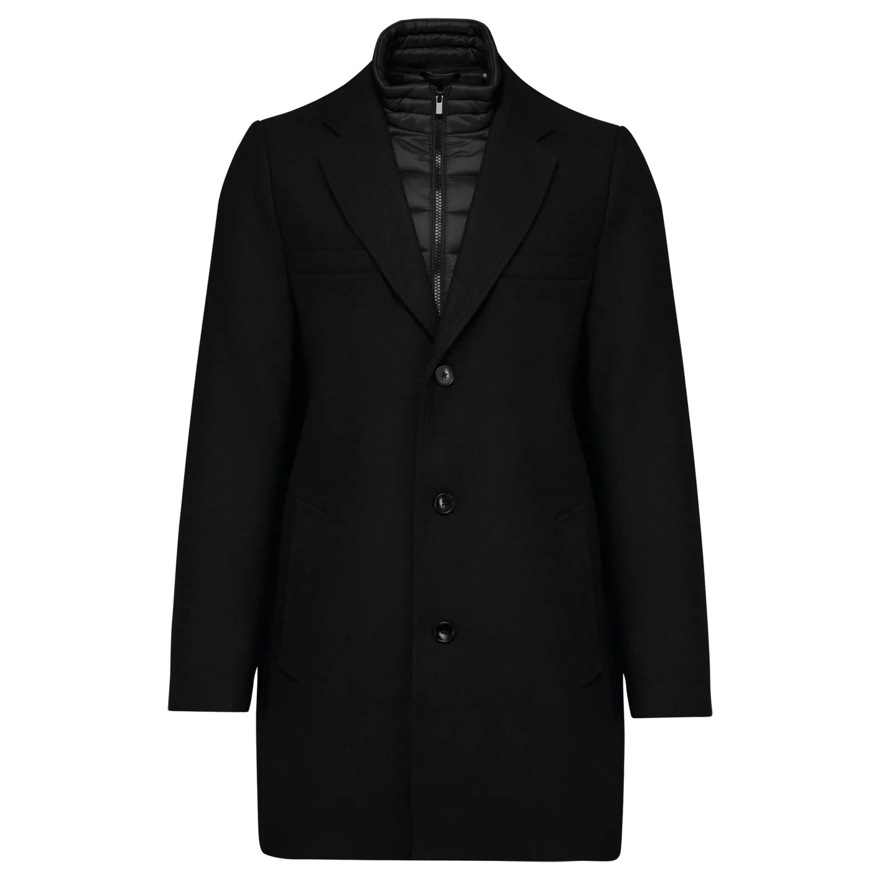 El Abrigo de hombre es un abrigo de corte recto con cuello sastre, cierre de cremallera y 3 botones. Pieza acolchada pespunteada desmontable, cuello peto delantero desmontable. Forro interior de sarga y bolsillos interiores ribeteados.